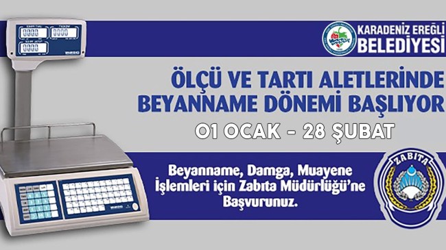 Kdz. Ereğli Belediyesi Zabıta Müdürlüğü, 3516 Sayılı Ölçüler Kanunu’na göre 2023 yılı damgalı ve 2023 yılında imal edilmiş damgalanmış ölçü ve tartı aletlerinin periyodik muayeneleri için 28 Şubat 2025 tarihine kadar beyanname doldurmaları gerektiğini duyurdu.