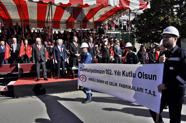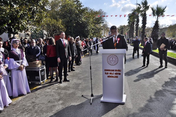 Devrim Bulvarı Sahil taksi önünden başlayan bayram törenine; Kdz. Ereğli Kaymakamı Fatih Yılmaz, Kdz. Ereğli Belediye Başkanı Halil Posbıyık, Zonguldak Milletvekilleri Saffet Bozkurt ve Eylem Ertuğrul, Karadeniz Bölge ve Garnizon Komutanı Tuğa. Yücel Korkut, Kdz. Ereğli Cumhuriyet Başsavcısı Mustafa Erbaş, Kdz. Ereğli İlçe Emniyet Müdürü Hasan Ünlü, Kdz. Ereğli İlçe Jandarma Komutanı Emrah Dinar, Kdz. Ereğli İlçe Millî Eğitim Müdürü Harun Akgül, kurum amirleri, öğretmenler, öğrenciler ve çok sayıda vatandaşlar katıldı.