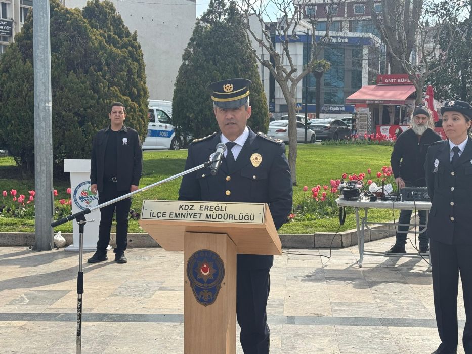 Atatürk Anıtı önünde gerçekleştirilen programa ilçe protokolü, siyasi parti temsilcileri, sivil toplum kuruluşlarının başkan ve üyeleri ile basın mensupları katıldı. Törende çelenk sunumunun ardından saygı duruşunda bulunuldu ve İstiklal Marşı okundu. Günün anlam ve önemine ilişkin konuşmayı Karadeniz Ereğli İlçe Emniyet Müdürü Hasan Ünlü yaptı. Ünlü, Türk Polis Teşkilatı’nın 181 yıllık köklü geçmişiyle milletin huzur ve güvenliğini sağlamak adına büyük bir özveriyle görev yaptığını ifade etti.