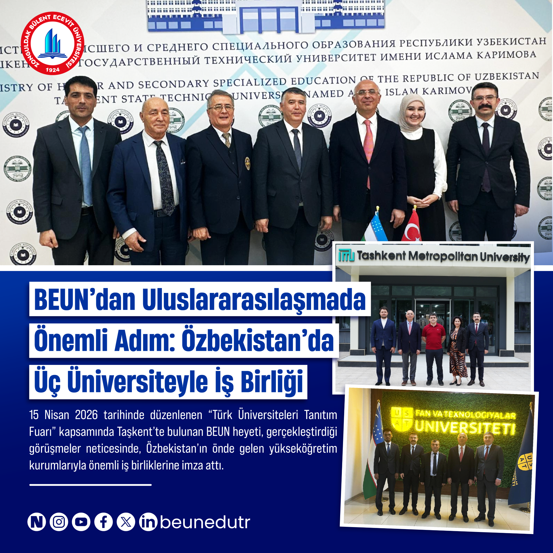 Zonguldak Bülent Ecevit Üniversitesi (BEUN), uluslararasılaşma vizyonu doğrultusunda Türk dünyasıyla akademik bağlarını güçlendirmeye devam ediyor. Bu kapsamda Özbekistan’ın başkenti Taşkent’te gerçekleştirilen temaslar, üniversitenin uluslararası iş birliği ağını daha da genişletti. 15 Nisan 2026 tarihinde düzenlenen “Türk Üniversiteleri Tanıtım Fuarı” kapsamında Taşkent’te bulunan BEUN heyeti, gerçekleştirdiği görüşmeler neticesinde, Özbekistan’ın önde gelen yükseköğretim kurumlarıyla önemli iş birliklerine imza attı.